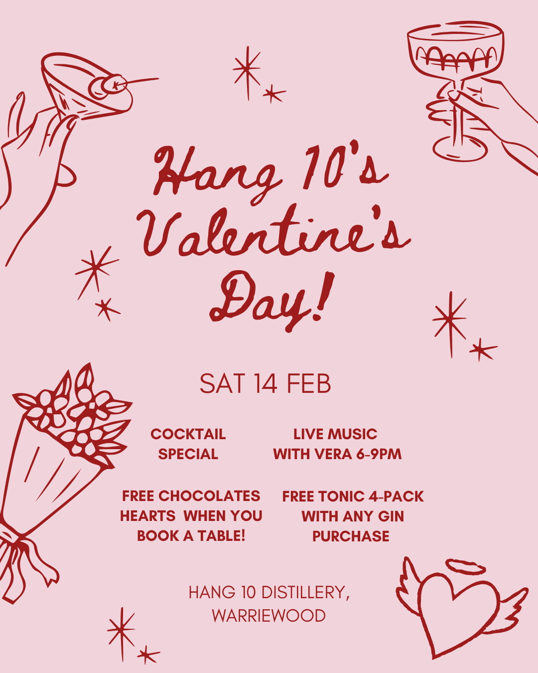 Valentine’s Day, Hang 10 style 💘 We’re open from 2pm for an easy afternoon into evening of cocktails, music and good vibes.
